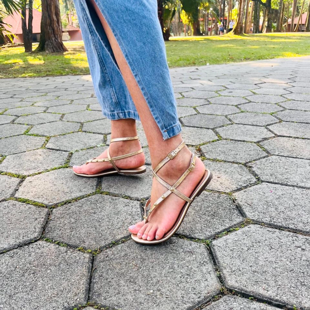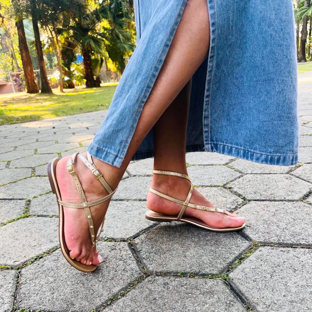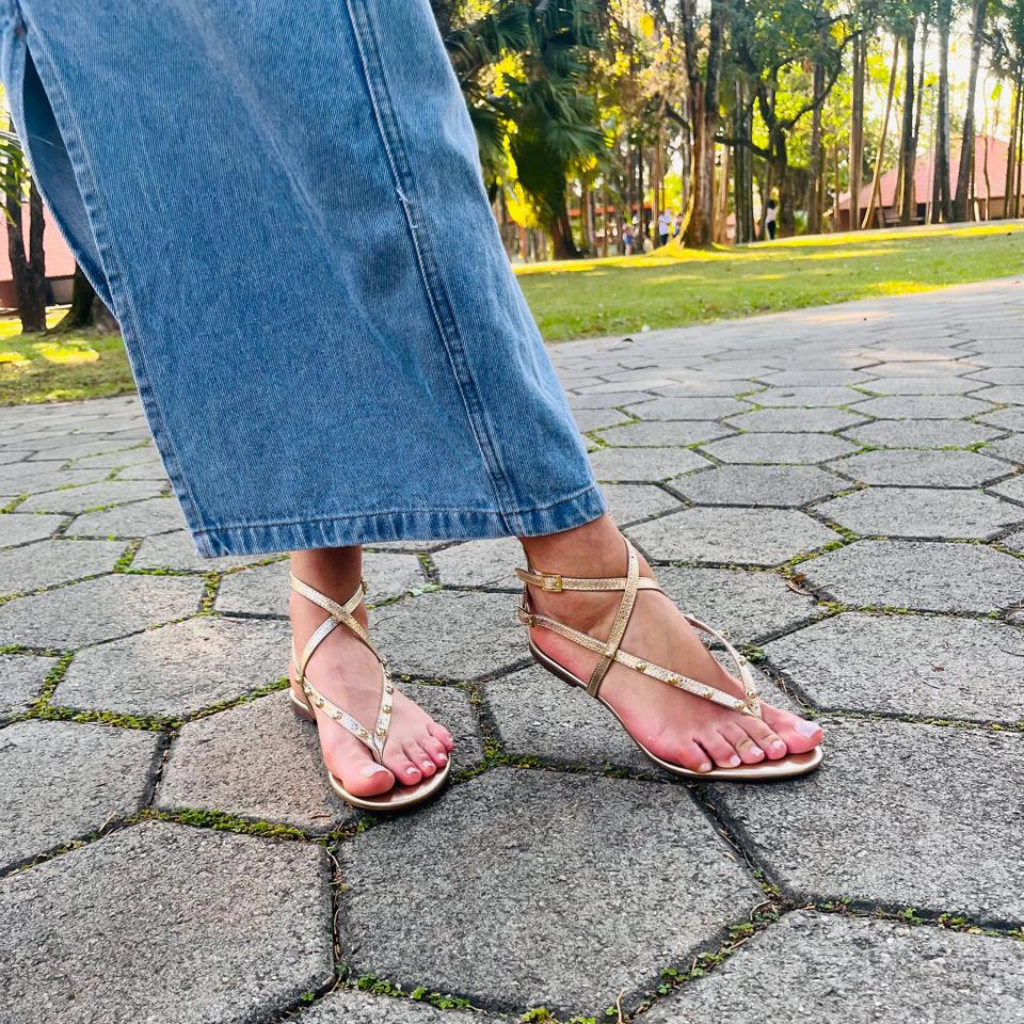 Rasteira Elegance Dourada Letalli, com tiras metalizadas e aplicações em tachas que combinam modernidade e sofisticação. Leve e confortável, é perfeita para compor looks casuais ou dar um toque de brilho em produções especiais.